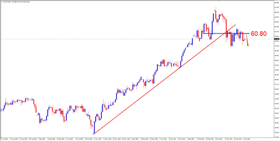 【交易策略】:目前市场格局呈现空头流向,建议投资者可考虑关注60.80附近做空,止损61.80附近,止盈59.00附近。