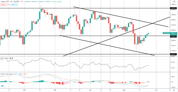 日经指数已经从空头通道的底部反弹,在26932.1水平之前获得支撑,现在回升至28356.6水平上方。随着MACD在这里转为看涨,重点放在进一步向熊市通道顶部推高并重新测试破损的牛市趋势线。