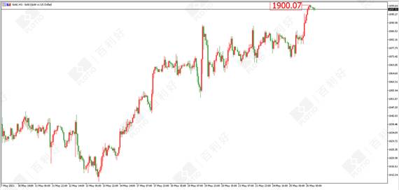 黄金方面:昨日(5月25日)晚间黄金打破近一周以来的震荡格局,多头发力向上突破,最高触及1900美元的位置。