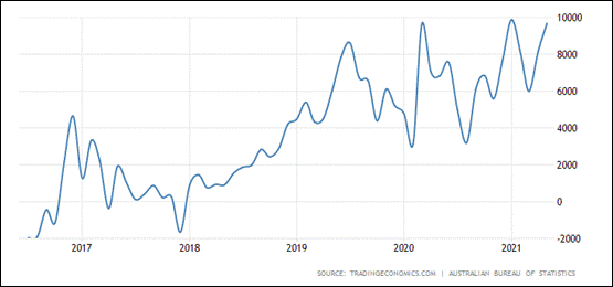 澳元作为商品货币,贸易数据对汇率有较大影响。疫情后澳大利亚贸易数据节节攀升,且已经超过了疫情爆发前的水平。据统计,澳大利亚5月贸易顺差超过96.8亿澳元,主要贡献来自于出口额的快速增长。