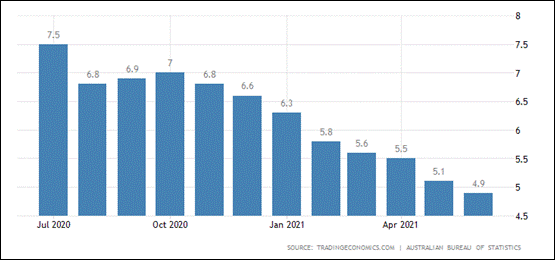 2021年7月15日,澳大利亚公布6月季调后失业率。数据显示澳大利亚上月失业率再次降低,公布值为4.9%,低于前值和预期。失业率数据下降表明澳大利亚就业市场处于欣欣向荣的状态,国内实体经济复苏强劲。