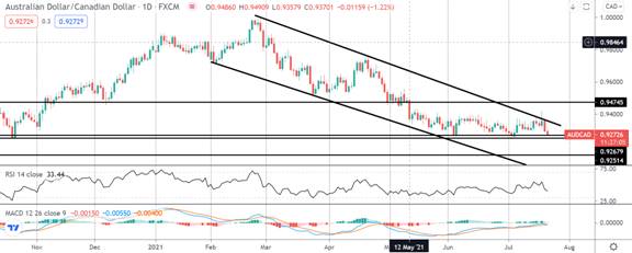 在过去的一个半月里,澳元兑加元在.9251-.9267的支撑位上处于盘整状态。虽然该货币对最近试图突破走高,但涨势被限制在测试熊市通道顶部,随后价格再次走低。价格现在再次测试支撑区域,看起来很容易在这里跌破。每日收盘低于较低支撑位(.9251)将为最初测试0.9267和之后测试0.9146开辟道路,该区域的熊市通道也处于低位。