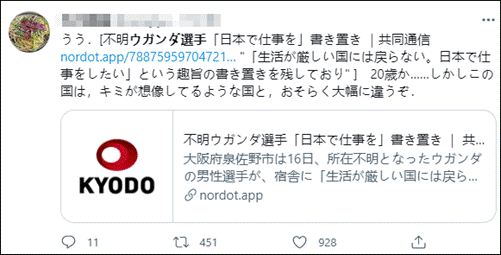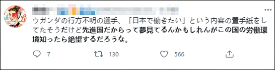 据《中日新闻》报道,消息一传出,“失踪的乌干达运动员”就上了日本社交媒体热搜。热心的日本网友纷纷劝退,表示日本工作环境恐怕和他想象的不同。