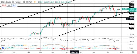 最近的石油抛售被证明是短暂的,市场从65.52水平和上升趋势线大幅反弹。此后价格回升至69.53水平上方,RSI转为看涨,MACD再次接近看涨。风险偏好的反弹是这一举措的主要推动力。如果美元因任何失望而走低,今晚的FOMC事件有可能进一步推动这一举措。
