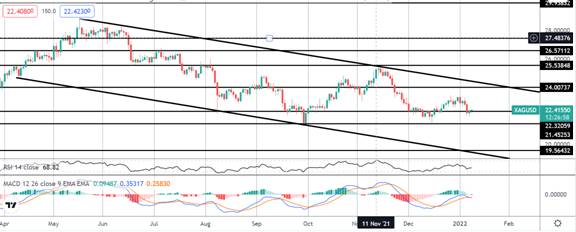 除了美元,更广泛的风险背景仍然是追踪的关键。股市相对于近期高点走低,反映出近期央行收紧政策的预期升温。尽管风险市场依然疲软,但金属可能会继续获得避险支撑。如果股市在短期内继续走低,这可能会继续对黄金提供广泛的支撑,尽管由于工业需求不足,白银可能会受到一些影响。