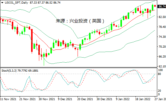 日图:保利加通道上扬,油价在中轨上方发展;14和20日均线看涨;随机指标走高。