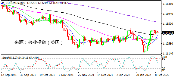 日图在前期高点1.1480附近反复拉锯,随机指标倾向自超买区域回落,略倾向下行。4小时图反弹在1.1450下方受阻多空拉锯,缺乏方向。小时图轻微走低至MA100下方,关键支持位于1.1400。日内建议关注1.1400一线决定进一步方向。