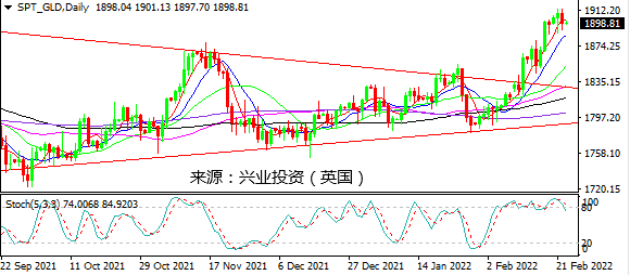 日图在1917阻力下方受阻回落并跌破MA5,随机指标倾向自超买区域回落,仍有望进一步下行。4小时图短期均线开始胶合,金价回补跳空高开缺口,增加下行风险。小时图空头动能增加,关注1893支持。日内建议寻求1905下方做空,先看1885。