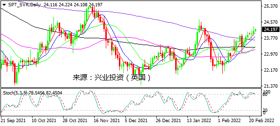 日图在MA5/10金叉支持下继续走高,但随机指标倾向自超买区域回落,对进一步上行保持谨慎。4小时图整体上行势头维持完好,初步支持关注24.00。小时图两度测试24.30一线有遇阻信号,随机指标受下降趋势线打压。日内建议谨慎操作,激进者寻求24.30下方做空。