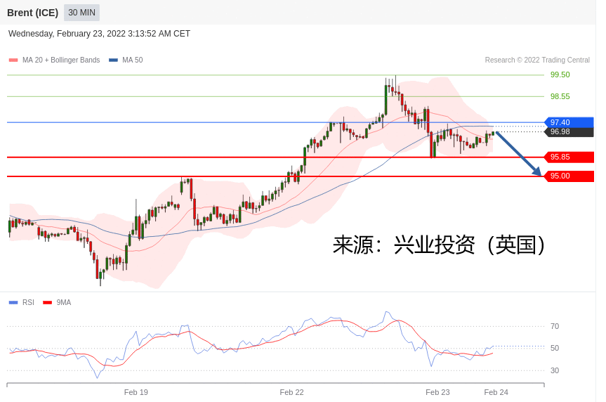 交易策略:在 97.40 之下,看跌,目标价位为 95.85 ,然后为 95.00 。