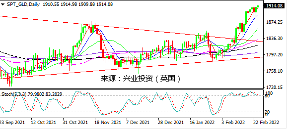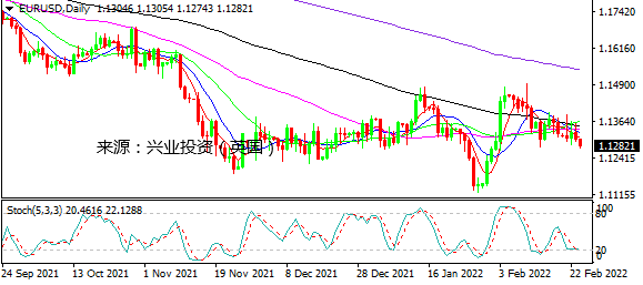 俄乌局势继续升级,美国股市进一步下挫,推动避险资产走高。黄金重新上行基本收复早前一天跌幅,测试近期高点1913附近。美元也重测96.20上方水平,日元和瑞郎走高。不过,澳元和纽元冲高在纽约盘回落,当天仍收涨,但长上影线暗示近期强势可能告一段落。加元因油价反弹一度强势走高纽约盘反转回吐部分涨幅。欧系货币英镑和欧元表现疲弱,欧元下探1.1280下方倾向继续走低,英镑在200日均线下方录得实体较大阴线。