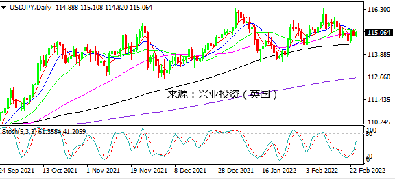 日图暂时受阻于MA20,随机指标倾向进一步走高。4小时图在115.30阻力下方受阻,关注能否上破。小时图横盘整理,关注114.85-115.25区间突破。日内建议寻求上破115.20跟进。