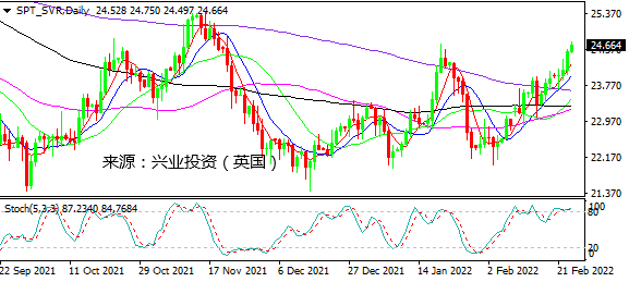 日图在MA5/10金叉支持下继续走高,测试前期高点24.70,关注该档表现。4小时图整体上行势头维持完好,多头仍占主导。小时图上破24.30后加速上行,当前在24.70一线有受阻迹象。日内建议谨慎操作,激进者寻求24.70下方做空并寻求24.30附近企稳反手做多机会。