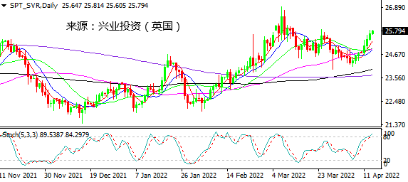 日图上行动能猛烈,当前测试25.85阻力,向上突破将存在更大的上行空间。4小时图短线多头占明显优势,维持看涨,关注前期高点25.85。小时图在上行趋势线上方走高,关注能否再创新高。日内建议谨慎操作,关注25.85一线表现决定进一步方向。