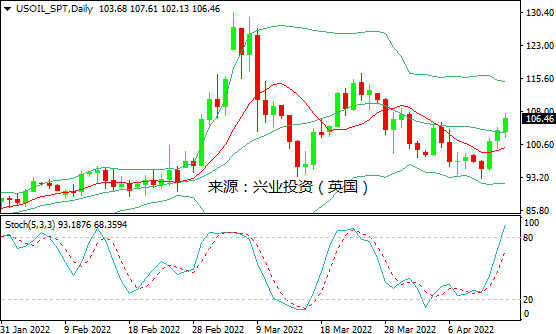 由于欧盟正计划分阶段对俄罗斯原油实施禁令,引发俄罗斯供应进一步下降并加剧供应趋紧忧虑,以及投资者在长假周末前押注乌俄局势紧张而进行空头回补操作,国际油价周四继续攀升,创两周新高。不过,美国活跃钻井平台数增加和IMF下调全球经济增长预期,或缓解油价上行压力。截止美国收盘,美国原油5月期货收涨2.74美元,或2.64%,报106.45美元/桶,盘中最高触及107.61美元/桶,最低跌至102.13美元/桶;布伦特原油6月期货收涨2.64美元,或2.43%,报111.46美元/桶,盘中最高触及112.34美元/桶,最低跌至106.63美元/桶。