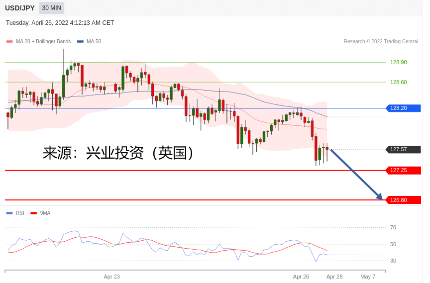 交易策略:在 128.20 之下,看跌,目标价位为 127.25 ,然后为 126.80 。