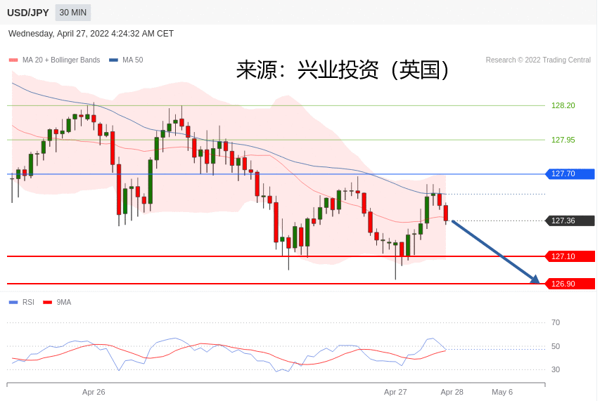 交易策略:在 127.70 之下,看跌,目标价位为 127.10 ,然后为 126.90 。