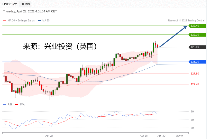交易策略:在 128.20 之上,看涨,目标价位为 129.10 ,然后为 129.40 。