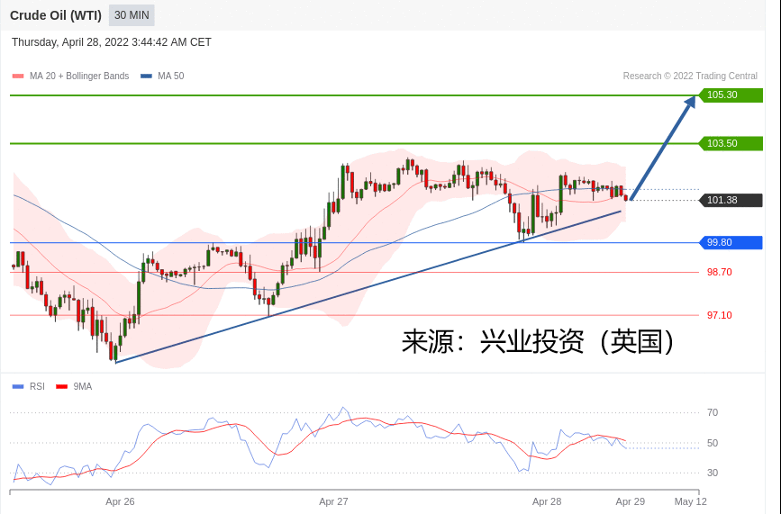 交易策略:在 99.80 之上,看涨,目标价位为 103.50 ,然后为 105.30 。