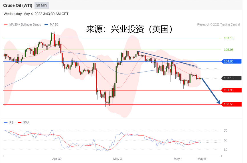 交易策略:在 104.80 之下,看跌,目标价位为 101.95 ,然后为 100.55 。