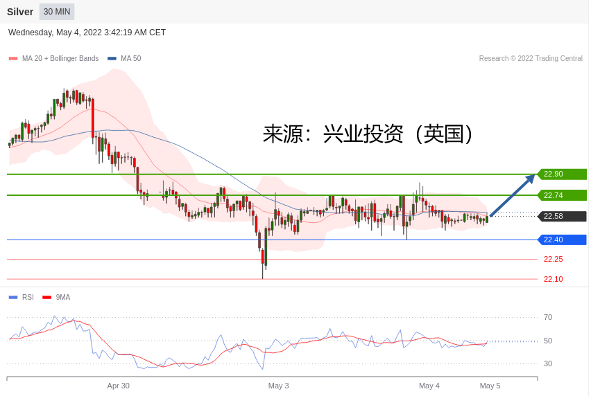 备选策略:在 22.40 下,看空,目标价位定在 22.25 ,然后为 22.10。