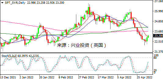 日图显示,银价上测10日均线,各主要均线仍保持下行势头,随机指标走高。4小时图显示,银价站上10和20周期均线,但仍位于下滑的100和200周期均线下方,随机指标进入超买区。小时图显示,银价在10、20和100小时均线上方交易,并试图突破200小时均线,随机指标在超买区企稳。日内建议在23.05附近买进,回落至22.90附近加仓,止损位设于22.75。