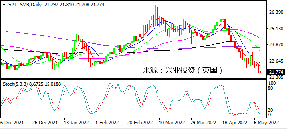 日图受MA5/10死叉打压进一步扩大跌幅,当前进入21.70-40支持区域,没有止跌信号但并不过分看空。4小时图下行势头维持完好,短线支持21.70。小时图震荡下行在21.70一线有所企稳,但缺乏反弹动能。日内建议稳妥观望,激进者在21.70一线轻仓做多,指数设于21.40,看22.10。