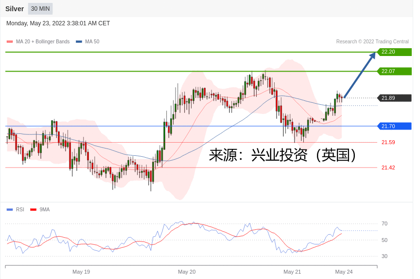 交易策略:在 21.70 之上,看涨,目标价位为 22.07 ,然后为 22.20 。