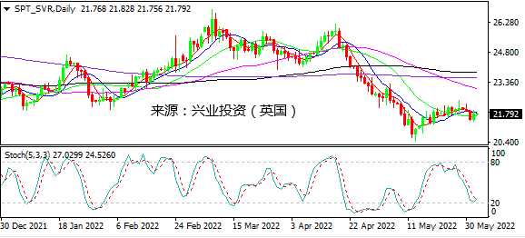 日图反弹收复早前一天大部分失地,但仍处于MA5/10死叉交叉下方。4小时图反弹缺乏跟进,对进一步上行保持谨慎。小时图大阳线拉升后在22.00下方反复受阻,该线不破仍有望继续下行。日内建议关注22.00一线表现决定进一步方向。