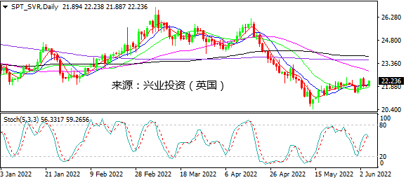 日图上行在22.50下方受阻但回落力度有限,MA20上方仍提供支持,暂时看震荡。4小时图大阴线缺乏跟进,重新上行测试MA200。小时图震荡走低在21.85一线企稳,今日亚市早盘大幅拉升,但可能是清淡市况所致,不应过***读。日内建议短线多头上看22.35一线并寻求遇阻反手做空机会。