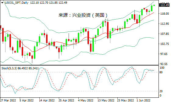 即便经合组织下调全球经济增长预测,但随着夏季驾驶高峰到来,北美和欧洲的需求上升,同时中国新冠肺炎疫情得到控制也提升了需求复苏前景,此外俄罗斯原油出口因其入侵乌克兰而受到制裁、伊朗原油未能入市和OPEC 无法兑现增产承诺,导致供应短缺忧虑挥之不出,国际油价周三仍继续攀升,创逾三个月新高。截止美国收盘,美国原油7月期货收涨2.69美元,或2.25%,报122.14美元/桶,盘中最高触及123.15美元/桶,最低跌至119.31美元/桶;布伦特原油8月期货收涨2.93美元,或2.42%,报123.82美元/桶,盘中最高触及124.37美元/桶,最低跌至120.42美元/桶。