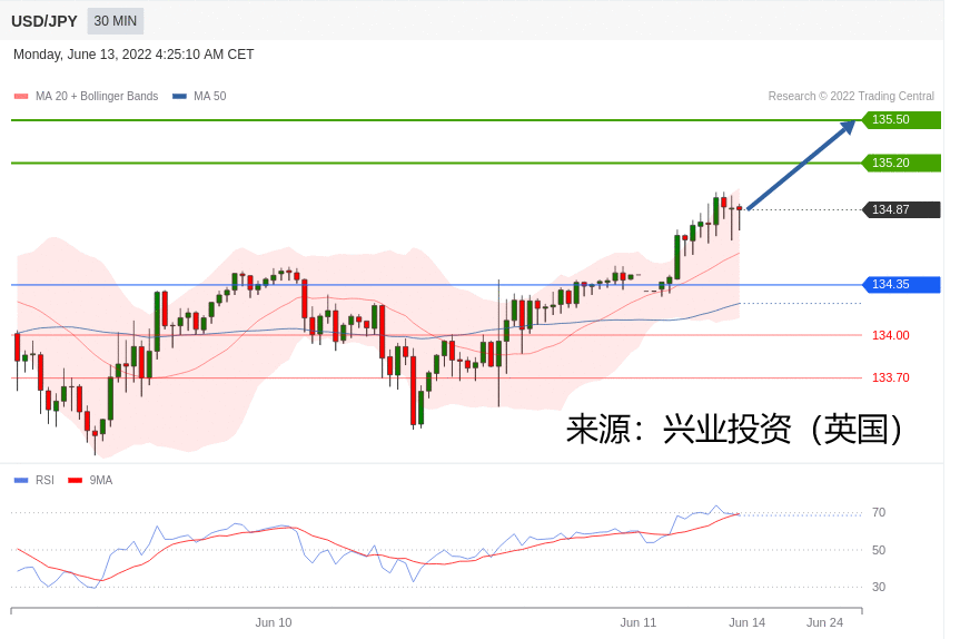 交易策略:在 134.35 之上,看涨,目标价位为 135.20 ,然后为 135.50 。