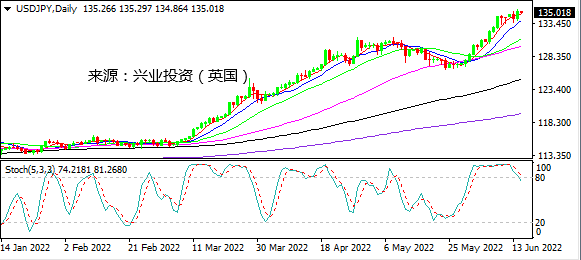日图在MA10上方进一步扩大涨幅,但随机指标倾向自超买区域回落,谨慎看震荡。4小时图在MA20一线挣扎向上扩大涨幅,但随机指标熊背离,对进一步上行保持谨慎。小时图企稳MA100走高,最高上探135.57,短线回调继续关注MA100支持。日内建议谨慎操作,关注135一线得失。