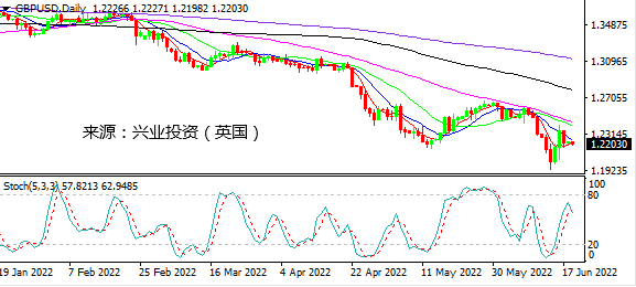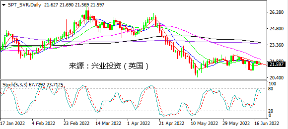 日图继续测试下降趋势线,随机指标略倾向走低。4小时图短线在22.00下方有所受阻回落但力度不强,反弹势头仍未破坏。小时图回踩反复测试下降趋势线,略偏弱。日内建议谨慎操作,可能维持在22.00下方震荡。