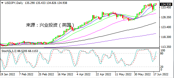 日图重新指向近期高点135.60一线,,随机指标熊背离,关注突破情况。4小时图V型反转,测试前期高点135.60附近有受阻迹象。小时图随机指标熊背离,短线承压。日内建议关注135.00一线表现决定进一步方向。