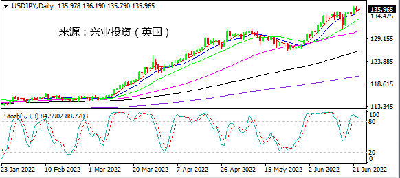 日图在高位谨慎拉锯,随机指标熊背离但均线上行仍提供支持。4小时图在136.65下方略有回落,力度不强。小时图自高位小幅回落,短线支持位于135.65。日内建议短线回调观望或快进快出,等待135.60一线入多机会。