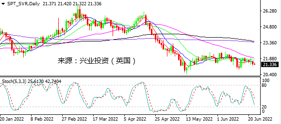 日图下行确认弱势,随机指标继续走低。4小时图在MA200受阻回落,仍偏弱。小时图盘中震荡,一度下探21.22随后反弹但在21.60下方受阻,当前走势依旧弱势。日内建议21.50下方做空,止损21.70,下破21.20跟进。