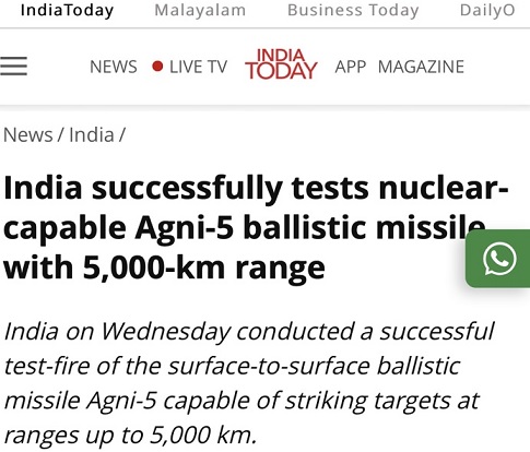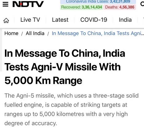 《今日印度》称,正值与中国针对拉达克区领土争议之际,由印度国防研究及发展组织(DRDO)研制的“烈火-5”导弹试射成功。