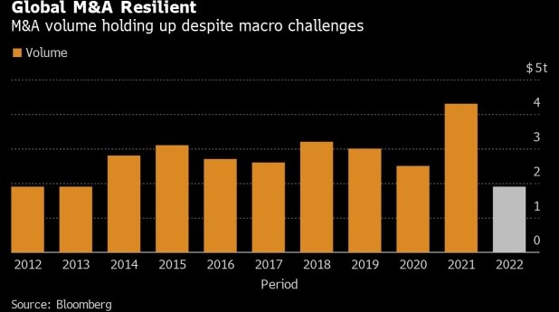 Mori在一份报告中写道,尽管融资环境不太有利,但今年的并购活动仍保持良好势头,但同时指出全球交易量已从2021年的历史高位回落。彭博汇编的数据显示,即使在传统上较为平静的夏季,仅在周一就宣布了价值221亿美元的收购案。