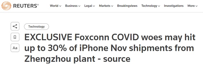 FX168财经报社(香港)讯 路透社周一(10月31日)报道称,据知情人士透露,苹果供应商富士康(Foxconn)位于中国郑州的大型iPhone制造工厂因新冠肺炎疫情而陷入困境,可能导致该工厂11月iPhone出货量减少至多30%。
