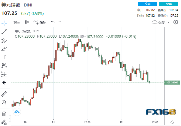 美市盘中,美元指数延续跌势并刷新日低至107.22,日内在窄幅区间内波动。