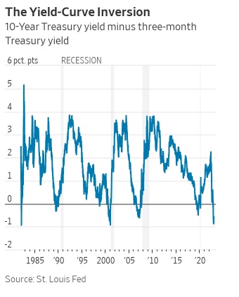此外,3个月至2年期的美国政府债券的收益率高于10年、20年或30年期的债券。这种所谓的收益率曲线倒挂是二战以来美国每次衰退前都会出现的一个警告信号。