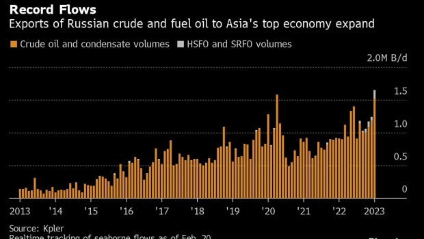 根据Kpler截至2月20日的数据,上个月俄罗斯对中国的原油和燃料油总出口量达到每天166万桶。这超过了2020年4月这个亚洲国家刚刚摆脱最初的疫情限制时创下的纪录。原油和凝析油流量上升至每天152万桶,略低于近三年前创下的纪录。