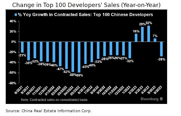 据中国房地产信息有限公司(China Real Estate Information Corp.)的数据,中国100家最大开发商6月份的销售额较上年同期下降28%,当时疫情防控措施仍在实施。彭博资讯(Bloomberg Intelligence)分析师Kristy Hung预计,今年剩余时间内销售额将进一步下降10%以上。