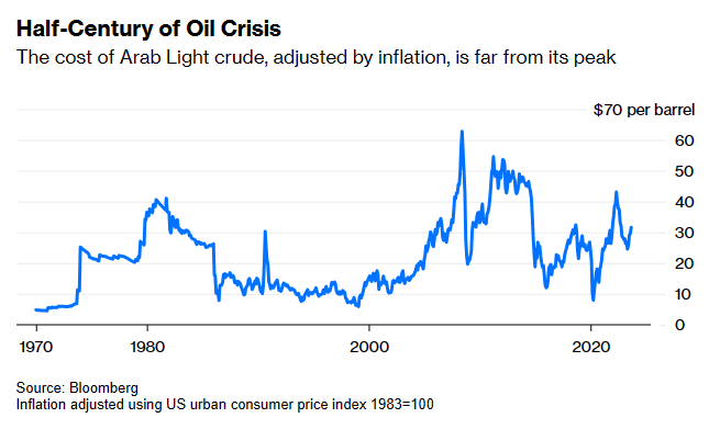 (过去半个世纪的石油走势,资料来源:彭博社)