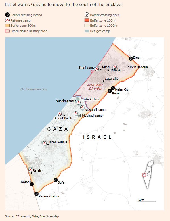 联合国称,以色列对加沙地带约一半的人口,从北部迁至该飞地的南部的警告,附带有一个24小时的期限,以色列维持了对这个40公里长的飞地的封锁和轰炸,尤其是其主要城市。