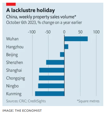 在经历了数月的低迷之后,这些措施引发了乐观情绪。但这种兴奋正在消退。中国今年的国庆假期从9月29日持续到10月6日,通常是买房的黄金时间。这次不是这样。根据研究公司cric的数据,上海和深圳的假日销售按总建筑面积计算分别同比下降79%和57%。而北京和上海是中国最强劲的两个房地产市场。本周至少有其他七个大城市的房价跌幅超过30%。新冠疫情爆发的武汉和科技中心杭州则出现了不明原因的增长。
