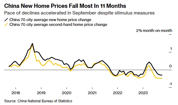 中国国家统计局(National Bureau of Statistics)周四公布的数据显示,9月份,中国70个城市不包括保障性住房在内的新建住宅价格较8月份下跌0.3%,8月份的跌幅为0.29%。这是自2022年10月以来最大的环比降幅。