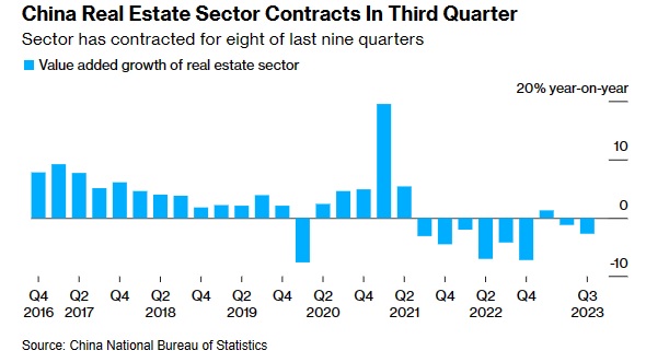 根据中国国家统计局发布的另一项数据,中国房地产行业产值在2023年第三季收缩2.7%。在过去9个季度中,该行业的产出有8个季度出现萎缩,这是中国自上世纪90年代末建立私人房地产市场以来最长的一次衰退。