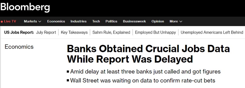 FX168财经报社(亚太)讯 当地时间周三(8月21日),美国非农就业数据初步修订的发布晚了半个多小时。然而,据美国彭博社独家报道,至少有三家银行想方设法提前拿到了这一关键数据。